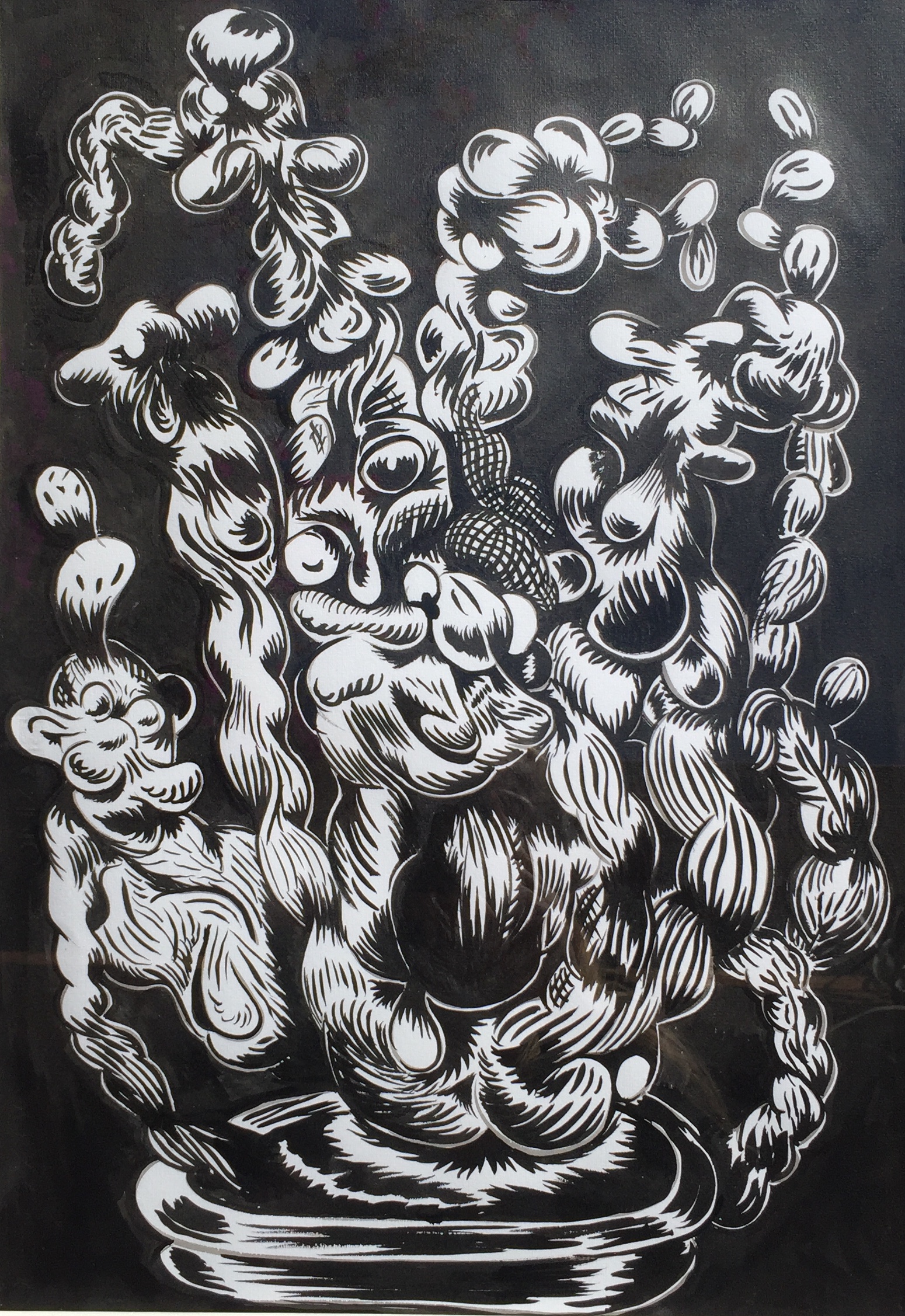 -9 serigraphs of 10x10 of wrestler's masks in red and blue ink, a 20cm x 25 painting of the Bimcumbi collective. 3 Serigraphs in black of a beetle, a bat and a Chinese golden cat.